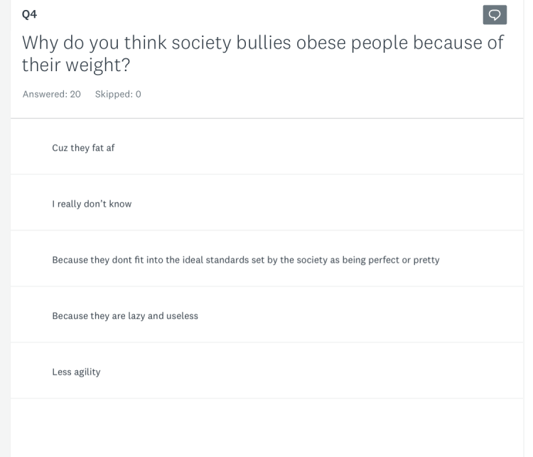 The topic I decided was fitness and I wanted to help and create awareness to the society about a problem (social issue) related to it. So I chose the most common (social issue) related to fitness nowadays which is body shaming. This problem , (social issue) is very much normalized in the society and people do nt understand the effect of it. They think making fun of obese people will lead to their weight loss,however this only will cause stress , it will reduce self esteem and depression in some cases. So I decided to pick this particular (social issue).